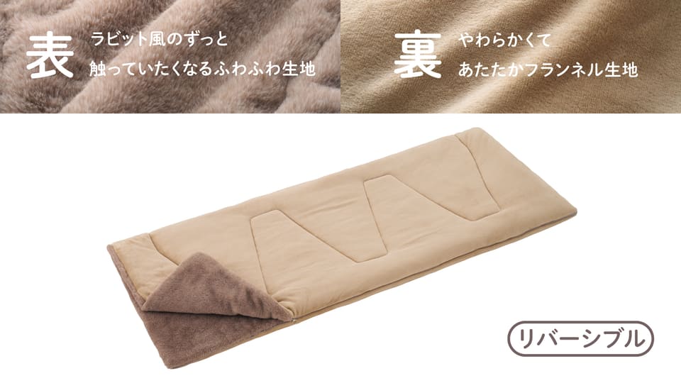 昨年発売した「丸洗いラビットファータッチシュラフ・0」の進化版。ラビットファーのような毛足の長いふわふわ生地と、肌触りのよい柔らかなフランネル生地のリバーシブル構造なので、好みの方を肌面にして使用できる。また、うさみみをイメージしたネックウォーマーが備わり、寒い時期のキャンプでも首周りの冷気を防げるのが特徴。ネックウォーマーはまくらとしても使用可能。