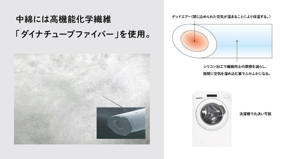 中綿には、軽量ながら保温性のある高機能化学繊維「ダイナチューブファイバー」を採用。これをシリコン加工で繊維同士の摩擦を減らし、繊維の隙間にも空気を溜め込む仕組みを作り、ふかふかの使い心地を実現した。