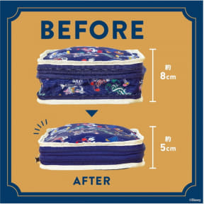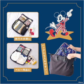宝島社、おそろいのパジャマを着たミッキーたちの圧縮収納ポーチ。旅行やベビー用品、家で衣類の収納などに