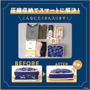本体サイズは約31×23×8cm(幅×奥行×高さ)だが、中身を詰めたあとに収納用とは別のファスナーを閉じると、ポーチの高さを約5cmまで圧縮できる。また内部には2つのメッシュポケットが付き、旅行のほかベビー用品や、家での衣類の収納などさまざまなシーンで役立つという。