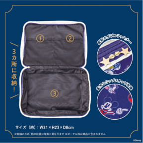 外側のリップストップ生地に、おそろいのパジャマを着たミッキーやフィガロなどディズニーキャラクターたちをプリントした圧縮収納ポーチ。