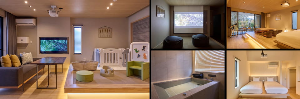 いずれの客室にも、天然温泉かけ流し風呂のほか、プロジェクター、小上がり、天体望遠鏡が設置してあり、家族やグループで快適に過ごせるという。