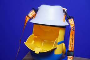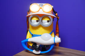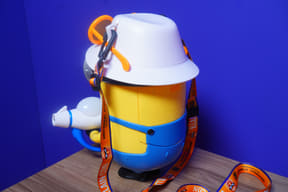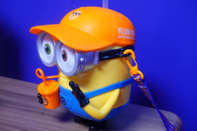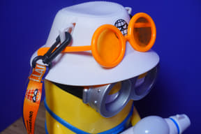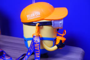最大の特徴は、新アトラクションでゲストも用いる電気銃「イーリミネーターX」を構えたミニオン(デイブ)の姿。悪党になりきって光線(ブラスター)をぶっ放し、盗んで破壊して高得点を目指すというアトラクションのストーリーどおり、ワルな目つきとニヤリとした口元がかわいらしい。また、青いトリガーを押すとピカピカ光る仕様で、新エリアの舞台となる大悪党大会「ヴィランコン」のロゴも、白いハットとネックストラップにあしらわれる。