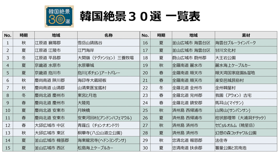 こうした課題への対応として、JOTCと韓国観光公社は地方誘客の促進を狙う「韓国絶景30選」(eBook版)を新たに選定した。観光写真公募展の受賞作に含まれる観光地などに基づいて候補群68か所を選抜、地域の分散・周辺との連携・地域の名物料理などを考慮して、韓国ワーキンググループ所属の旅行会社14社の専門家らによって30か所まで絞り込んだ。これにはJOTCメンバーでも知らなかったような場所がいくつも含まれているという。