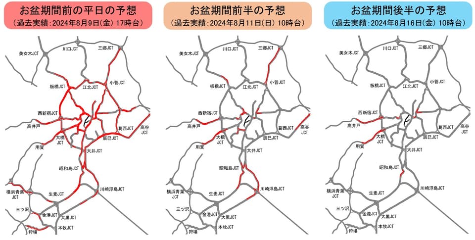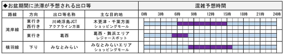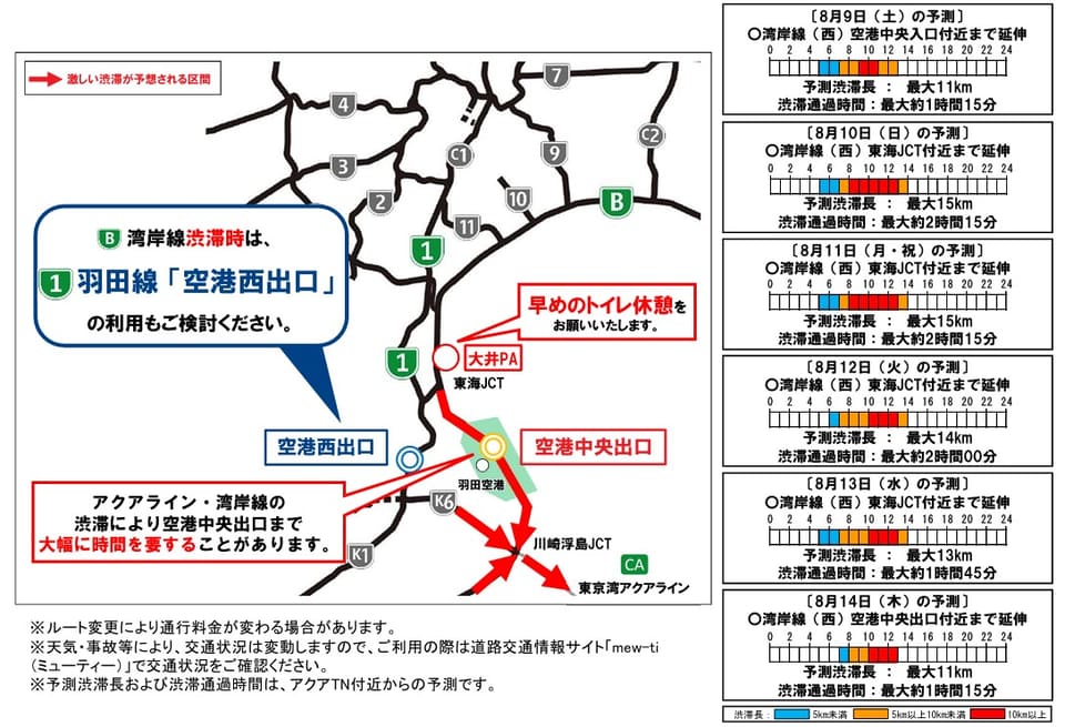 お盆中は渋滞が少ない傾向にあるものの、前半(9日~12日)を中心に、観光地周辺の出口など一部の区間で局所的な渋滞が発生する見込み。特に東京湾アクアライン方面および葛西出口付近の湾岸線や、みなとみらい出口付近の横羽線では通常より早い時間から渋滞を予想する。