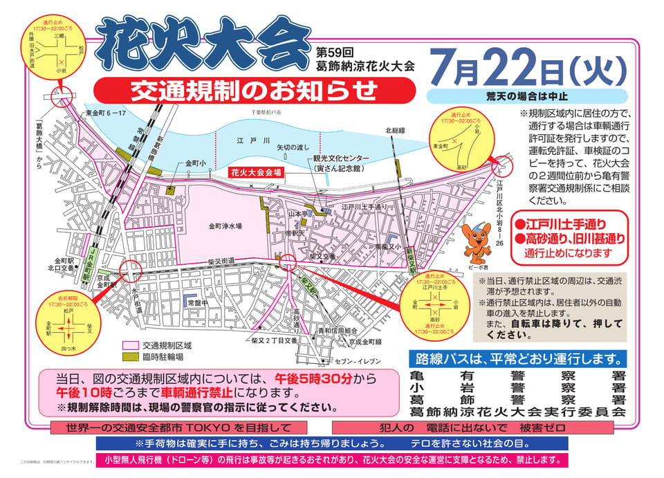 「第59回葛飾納涼花火大会」7月22日開催。交通規制実施もバスは通常運行、京成・北総線は増便