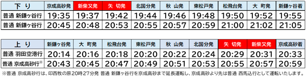 また、新柴又駅が最寄りの北総線でも初めて増便を行ない、19時台から20時台にかけて京成高砂駅~新鎌ヶ谷駅間で2往復を設定する。一部は定期列車の延長運転となり、上り列車は京成線・都営線にも直通する。