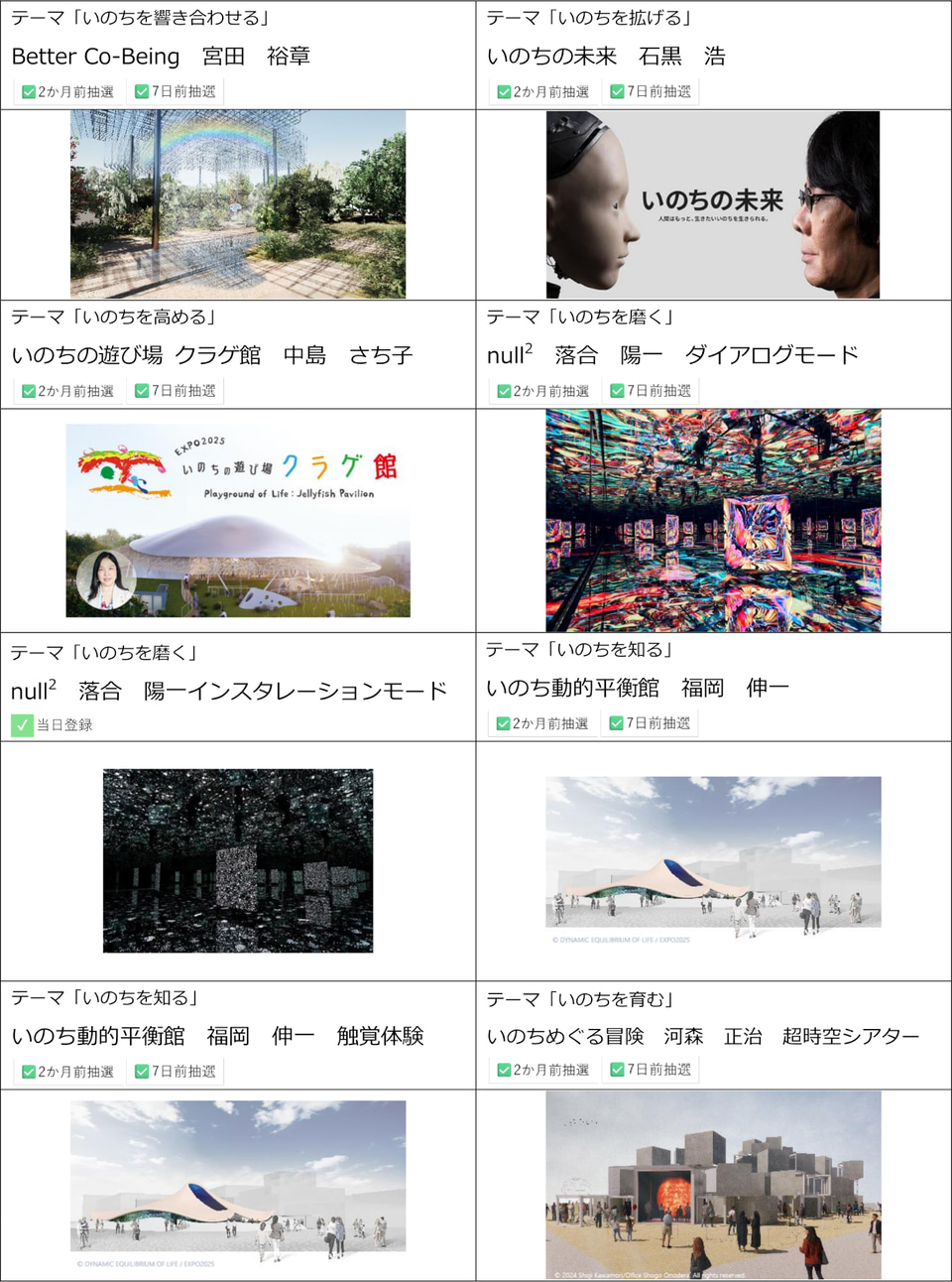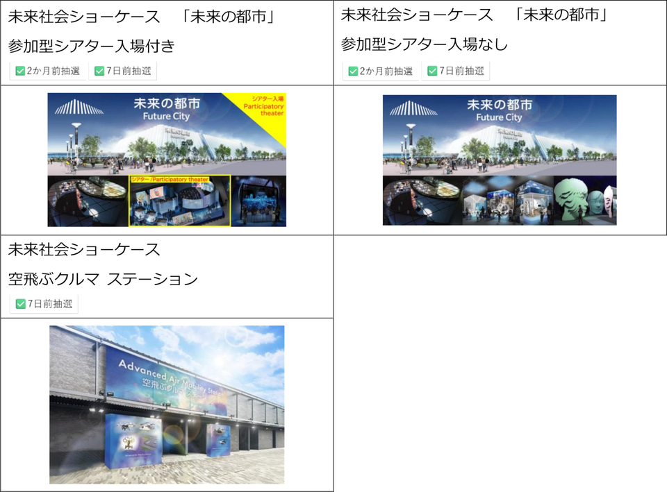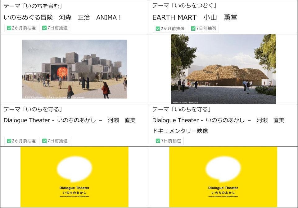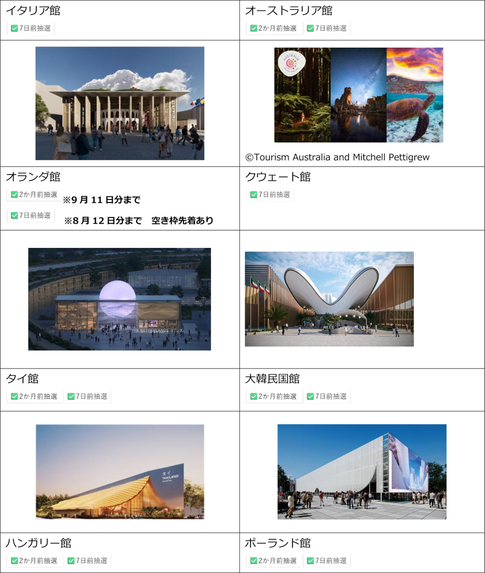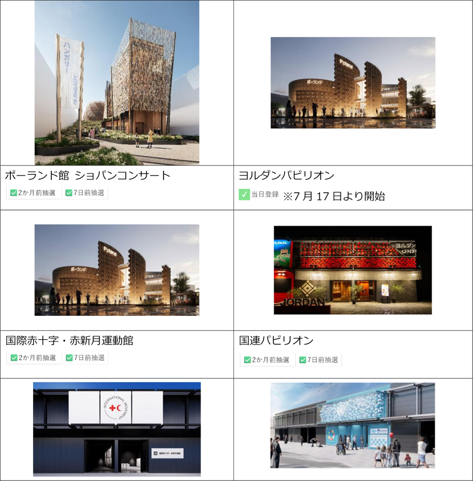 今回更新したリストには、2か月前・7日前抽選や当日受付の対象となるパビリオンの情報をまとめて掲載している。