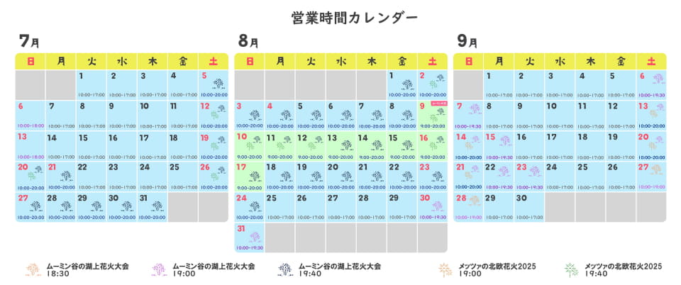 さらに7月~9月の夜の時間帯は、「ムーミン谷の湖上花火大会」も予定。宮沢湖の湖上から一斉に花火が打ち上げられるイベントで、鮮やかな光と色彩が夏空を華やかに彩るとのこと。