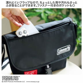 特別付録はコールマンとスヌーピーがコラボしたメッセンジャーバッグ。サイズは約28.5×8.5×22cm(幅×奥行き×高さ)とコンパクトながら水筒やポーチ、お財布なども入る収納力を持つ。フロントはフタのようにバッグに被せるフラップ仕様で中身が濡れにくく、ファスナー付きポケットを搭載。また、背面にも小物の出し入れがしやすい大きなポケットを備える。