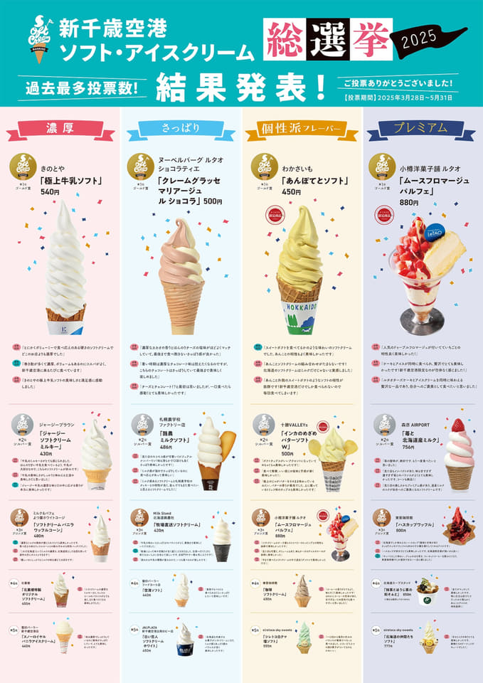 新千歳空港「ソフト・アイスクリーム総選挙2025」結果発表。濃厚/さっぱり/個性派/プレミアムの4部門
