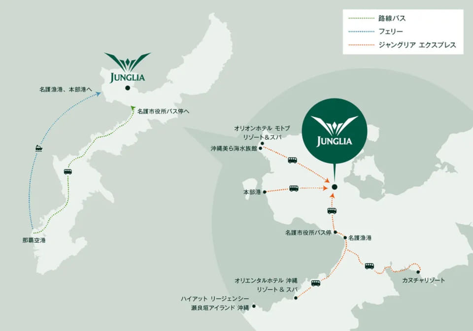 また、開業に合わせて公共交通や渋滞緩和策も整備が進み、ジャングリア沖縄まで乗り換えなしで直行できるバス「ジャングリア エクスプレス」が運行開始。発着地点は那覇空港、那覇市内(県庁前、国際通り入口)、名護市役所バス停、オフィシャルホテル、沖縄美ら海水族館で、いずれも予約制。