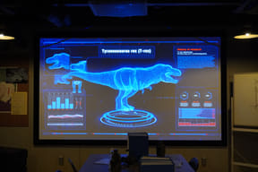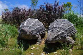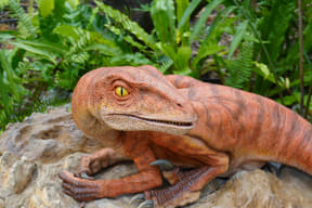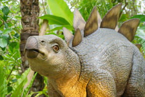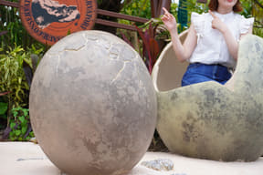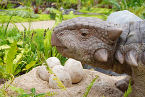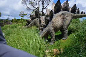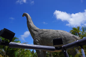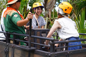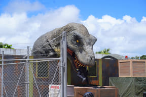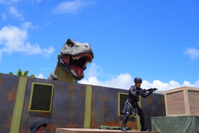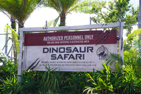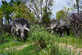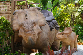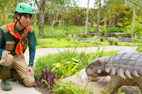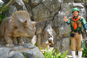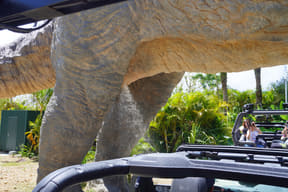 メインアトラクションのひとつ「ダイナソーサファリ」は、熟練ドライバーが運転する12人乗り大型オフロード車でジャングル奥地を冒険し、迫りくる巨大恐竜たちに対峙するツアー。周りの木々よりもはるかに巨大な20mのブラキオサウルスや3本の角が特徴のトリケラトプスなど、次々とリアルな恐竜に遭遇するなか、激しい咆哮でうしろを振り返ると最凶の肉食恐竜T-REXが登場。