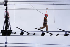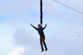 高さ約24.4mのタワーに立ち覚悟を決めると、足元の床が外れて急落下。さらに宙ぶらりんの状態で滑走するジップライン。
