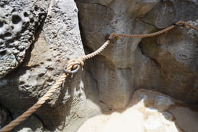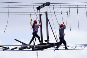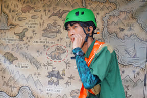 ロープを頼りに空の上を歩く、全長84mの難関アスレチック。不安定な踏み板の真下はジャングルの谷底。