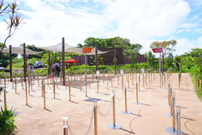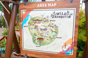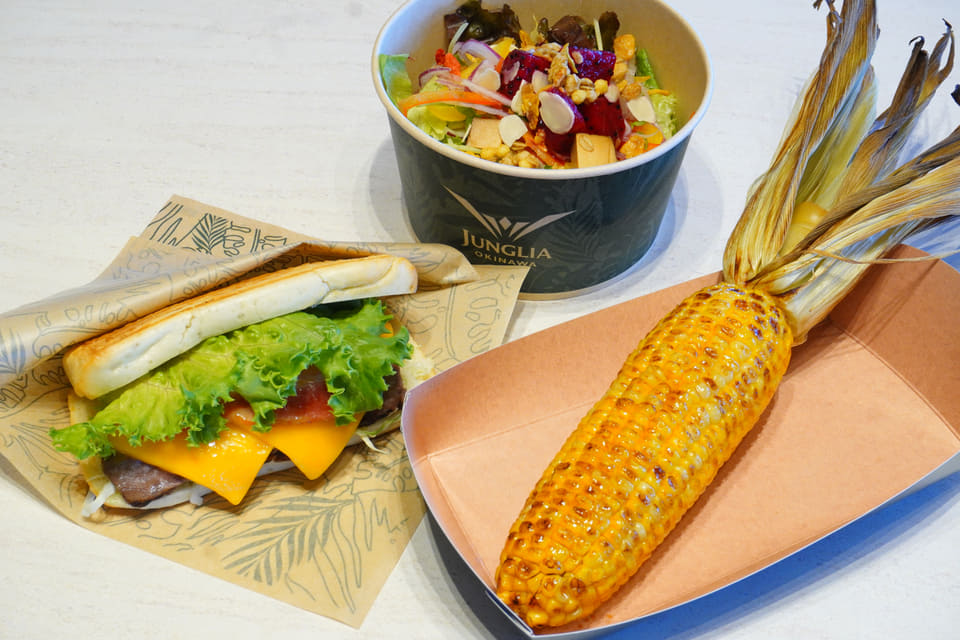 熱帯植物に囲まれたパーク中心部の野外レストラン「ワイルドバンケット」では、ライブキッチンで豪快に焼き上げた石垣産黒毛和牛のグルメバーガー(2200円)や葉付きのトウモロコシを手掴みでかぶりつくグリルコーン(1000円)などを販売。また、パーク内に点在する「フードカート」でも、この夏にもオススメという冷やしアジアンヌードル(1200円)やたっぷりマンゴーのトロピカルスノーアイス(1300円)、シークワーサー味のもっちりチュロ(650円)、フローズンパイナップル(600円)、スペアリブ(750円)、柑橘の爽快なタンカンスカッシュ(650円)、オリオンビール(550円)などを販売する。