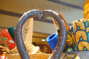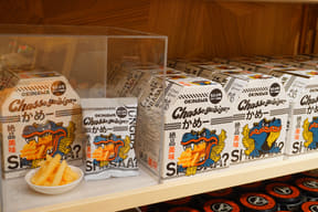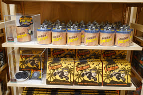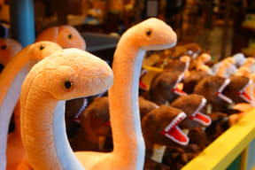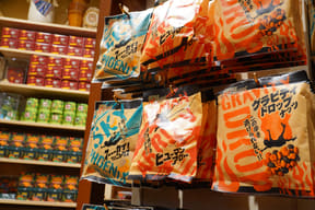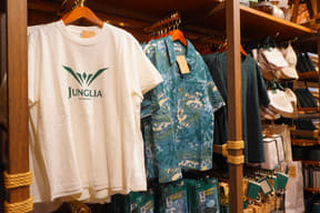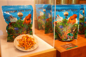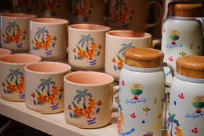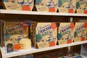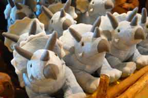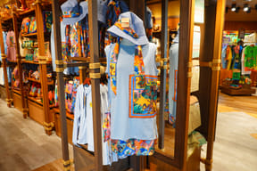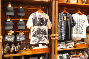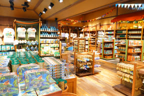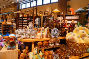 大型ショップ「ビレッジバザール」では、恐竜や各アトラクションをモチーフにした雑貨やぬいぐるみ、カチューシャ、デザイン性にもこだわるアパレル、お菓子など、沖縄らしいお土産約550種類を取り揃える。