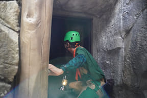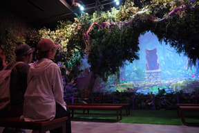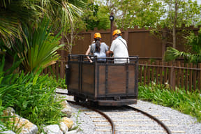 迷子になった恐竜の赤ちゃんを探すジャングルツアー。途中にはトロッコや吊り橋、洞窟見られる神秘的な光景も……。体験時間約14分。
