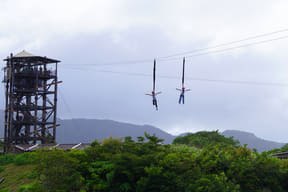 高さ約18mの巨大な空中ブランコに乗り、森に向かって高速スウィング。