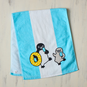 夏らしいSuicaのペンギンをデザインしたフェイスタオルとトートバッグのセット。フェイスタオルには、Suicaのペンギンと子ペンギンがアイスを片手に夏を満喫する様子を描いている。