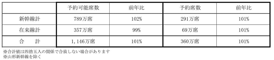 予約可能席数は前年比101%増の1146万席、うち予約席数は前年比101%増の360万席。下りのピークは各社で8月9日に集中しており、JR東日本では午前から夕方にかけて多くの列車が満席になっている。上りではピークが8月16日・17日に分散していることもあり、各社で余裕があると発表している。