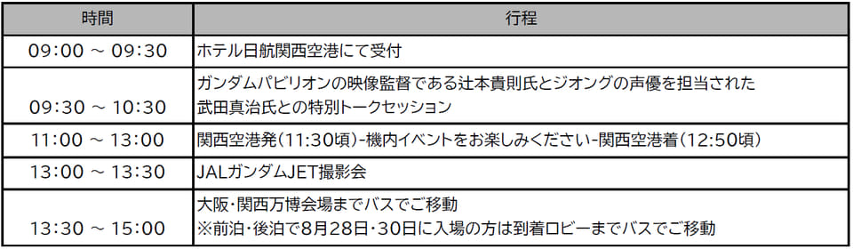 ガンダムのテーマが反映された機材で空の旅が楽しめ、機内では万博パビリオン「GUNDAM NEXT FUTURE PAVILION」に関連する特別映像を放映。着陸後には、駐機スペースでJALガンダムJETを間近に見られる撮影会も実施する。また、ツアー開始前には、ガンダムパビリオンの映像監督・辻󠄀本貴則氏と、「ジオング」役を担当した武田真治氏による特別トークセッションを開催。貴重なエピソードや制作秘話が楽しめるという。
