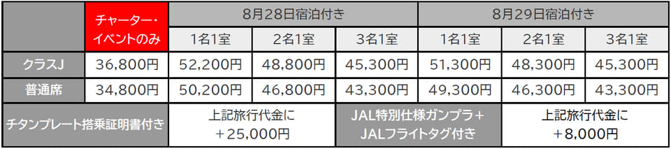 プランは3種類あり、日帰り(クラスJ3万6800円、普通席3万4800円)、8月28日宿泊付き(1名1室利用の場合クラスJ5万2200円、普通席5万200円)、8月29日宿泊付き(1名1室利用の場合クラスJ5万1300円、普通席4万9300円)。なお、宿泊付きは2名1室、3名1室も選べる。