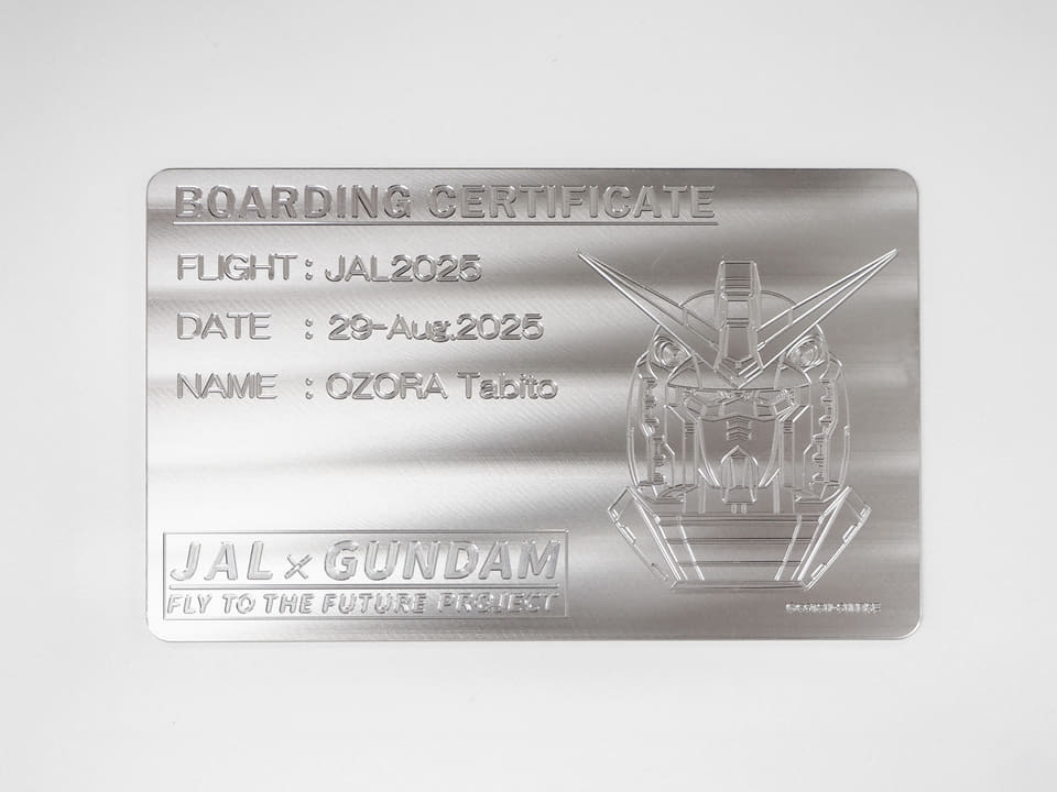 また、上記旅行代金に+2万5000円で名前・便名・日付入り「チタンプレート搭乗証明書」、+8000円で「JAL特別仕様ガンプラ&JALフライトタグ」をつけることも可能。