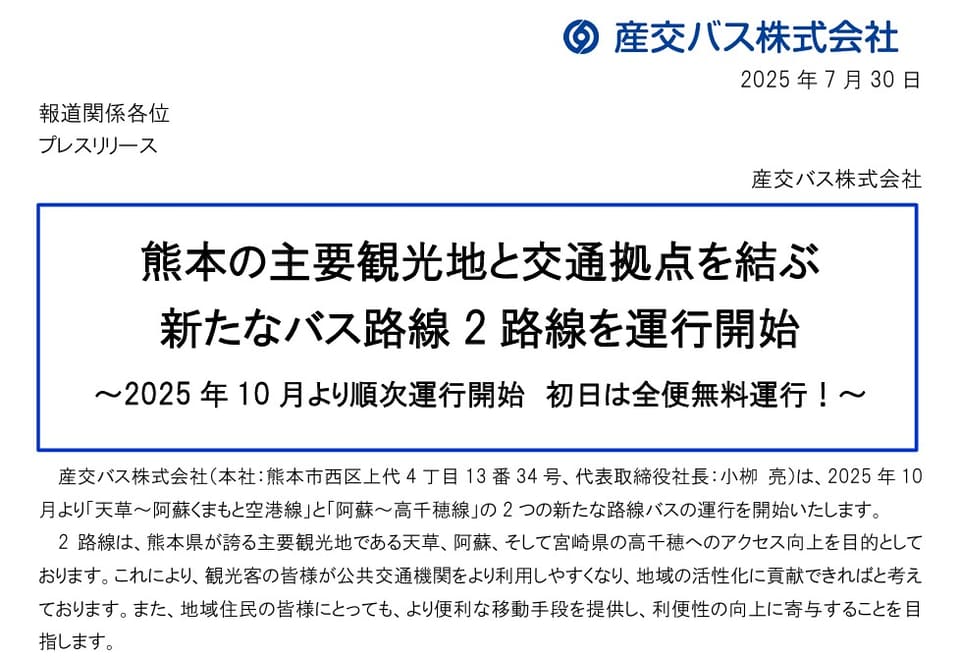 産交バスは、バス路線「天草~阿蘇くまもと空港線」を10月1日から、「阿蘇~高千穂線」を10月10日から運行する。