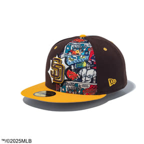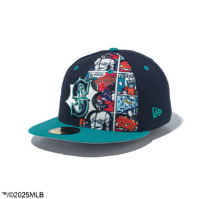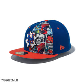 米大リーグ・MLBのチームキャップ「59FIFTY」モデルに、アメリカンコミック風のデザインを施したシリーズ。チームロゴを吹き出しのような枠で囲み、向かって右側との後ろには野球漫画風のイラストを配している。