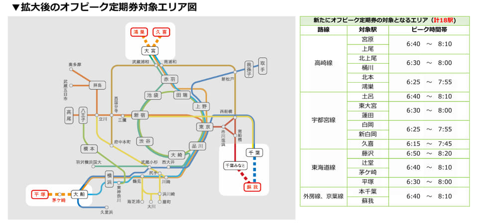 このほか、消費税を転嫁する際の1円単位の端数を四捨五入から一律で切り上げに変更し、IC運賃(1円単位)がきっぷの運賃(10円単位)を基本的に下回るようにする。また「オフピーク定期券」の設定エリアを宇都宮線の久喜駅、高崎線の鴻巣駅、東海道線の平塚駅、京葉線・外房線の蘇我駅まで拡大し、「オフピークポイントサービス」を廃止する。