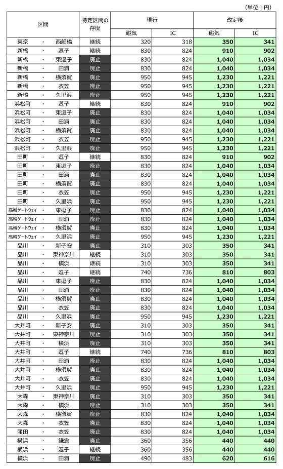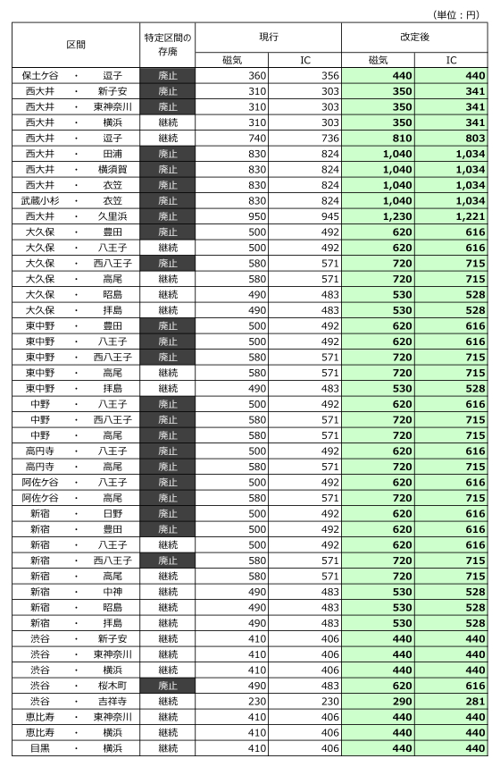 加えて、他事業者との競合を想定し区間別に安価な運賃を設定していた「特定区間」も一部廃止し、通常の運賃計算を適用する。こちらも今回の発表で具体的な設定区間を公開し、「渋谷~桜木町」「新宿~豊田」などが廃止となる一方、「渋谷~横浜」「新宿~八王子」などは設定継続となった。
