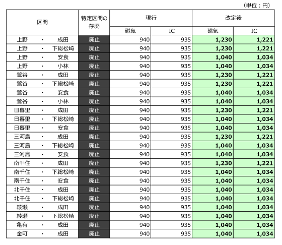 改定前後の、首都圏の主な区間における運賃の比較は以下のとおり(運賃は「IC運賃/きっぷ運賃」で表記)。