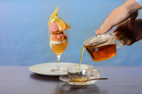 甘くてジューシーな旬の桃を贅沢に使用した“食べるピーチティー”のようなパフェ。グラスの中に、完熟桃のソルベやコンポート、ドライピールにパイ、ジャスミンミルクティーのアイス、カシューナッツのキャラメリゼ、和紅茶のサブレといったこだわり素材を重ね、仕上げには静岡県産「丹那牛乳」のパンナコッタと桃&ダージリンのジュレを添える。