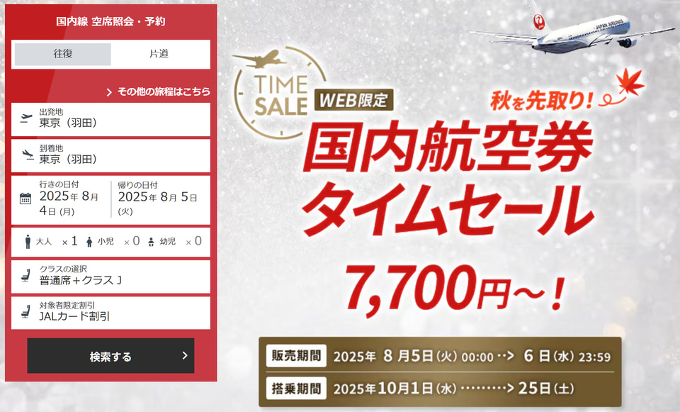 JALは、Web限定「国内線航空券タイムセール」を8月5日0時~6日23時59分に実施する。対象搭乗期間は10月1日~25日。