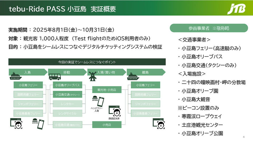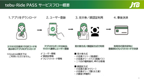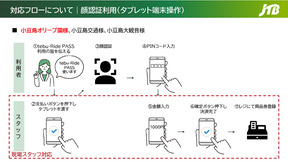 ビーコン(近距離無線通信技術)と顔認証技術を利用して、高速艇、バス、タクシーなど異なる交通機関の利用や観光施設への入場、売店での購入などを、専用アプリ「tebu-Ride PASS」をインストールしたスマートフォンだけで完結。旅行者の移動をスムーズにするとともに、事後決済方式の採用で旅行中の支払を簡素化。また、利用額に応じた割引制度も提供することで付加価値を向上させる。これにより、地域の魅力向上、観光事業者の省力化や生産性向上、観光客の利便性向上を目指すという。