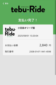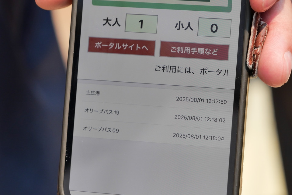 路線バスの乗車では、tebu-Ride PASSアプリで乗車バス停と下車バス停が正しく認識され、スムーズな乗車が可能だった。小豆島オリーブバスは交通系ICカードでの運賃精算も可能なため、交通系ICカードの利用と比べるとそこまで大きな利便性向上ではないが、家族やグループで乗車する際に1台のスマートフォンで全員分の支払いが完了するのは便利だ。