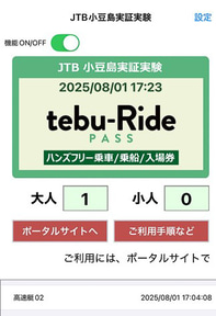 例えばバスを利用する場合、バス停に近付くとバス停に設置されているビーコンの電波をスマートフォンが受信し、乗車バス停を特定するとともに、tebu-Ride PASSアプリにバス乗車用の見せ券を自動的に表示。見せ券では、乗車する大人と子供の人数を設定できるため、家族やグループで乗車する場合でもスマートフォン1台で対応可能だ。