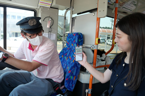バスを下車するときは、降りるバス停に設置されているビーコンの電波を受信して下車バス停を特定。そして、見せ券を乗務員に見せて下車するだけでよい。運賃は、特定した乗車バス停と下車バス停から自動的に算出され、事後精算になる。