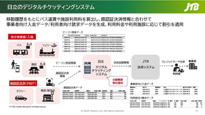 見せ券方式と顔認証方式で利用した交通機関や観光施設の利用料金は、日立が用意するクラウド上のデジタルチケッティングシステムに集約され、利用者への請求データと各事業者への入金データを作成。利用料金や施設ごとに割引きを行なったうえで、JTBの決済システムへデータが渡され、あらかじめ登録したクレジットカードで一括決済が行なわれることになる。