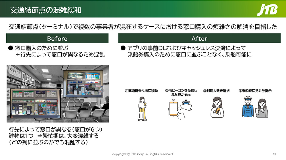 通常、高速艇の乗船券は港の窓口で購入するが、その窓口が行き先ごとに異なっているため、初訪問ではどの窓口で購入すればいいのか分かりづらい。また、実証実験期間中のうち8月31日までと10月3日以降は瀬戸内国際芸術祭の開催期間と重なる。その期間は高速艇を利用する観光客が大幅に増え、窓口が混雑して乗船券の購入にかなりの時間がかかることもある。しかも乗船券は基本的に現金決済だ。
