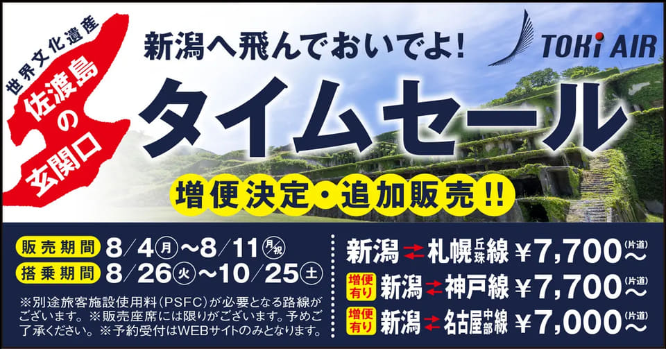 トキエア、本日からタイムセール。新潟発セントレア7000円~、札幌丘珠/神戸7700円~