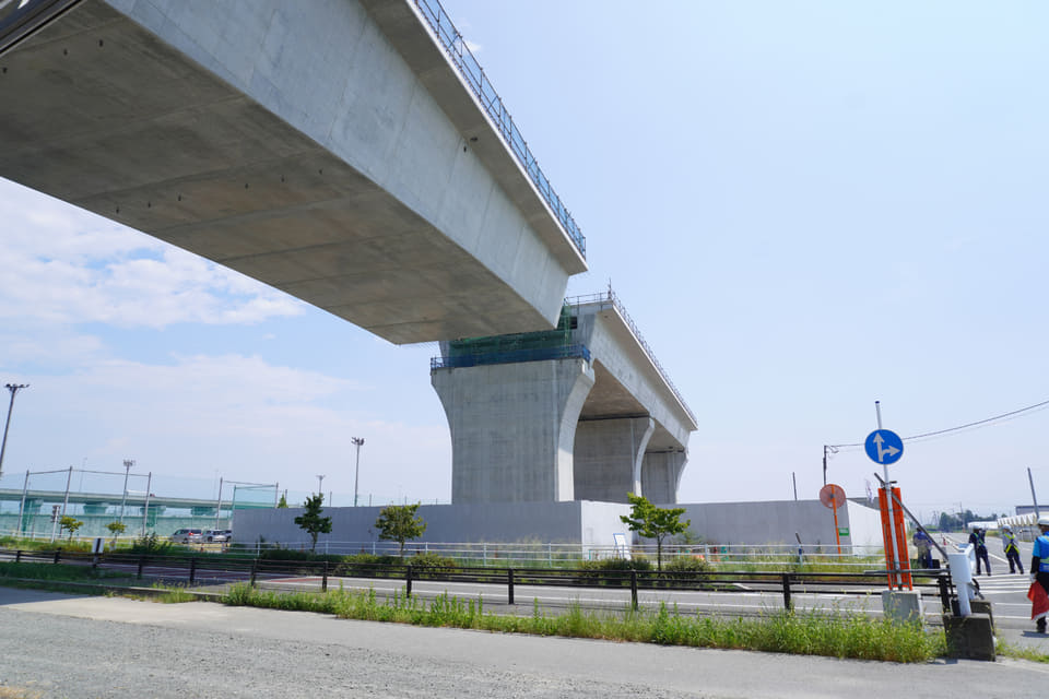 リニアの橋りょう上はガイドウェイが備わる分、新幹線用の橋りょうよりも橋幅が広く、時速500kmの走行に耐えるための強度に優れているのも特徴。最終的には防音・防災対策フードに覆われるため、公園などの周辺から“リニアが橋の上を走る様子”を見ることはできないというが、少しずつ完成に近づく橋の外観は、橋のふもとにある「総合防災公園」(山梨県中央市布施3564-1)や「田富ふるさと公園」(山梨県中央市臼井阿原1740-120)付近の河川敷からでも見上げることができる。
