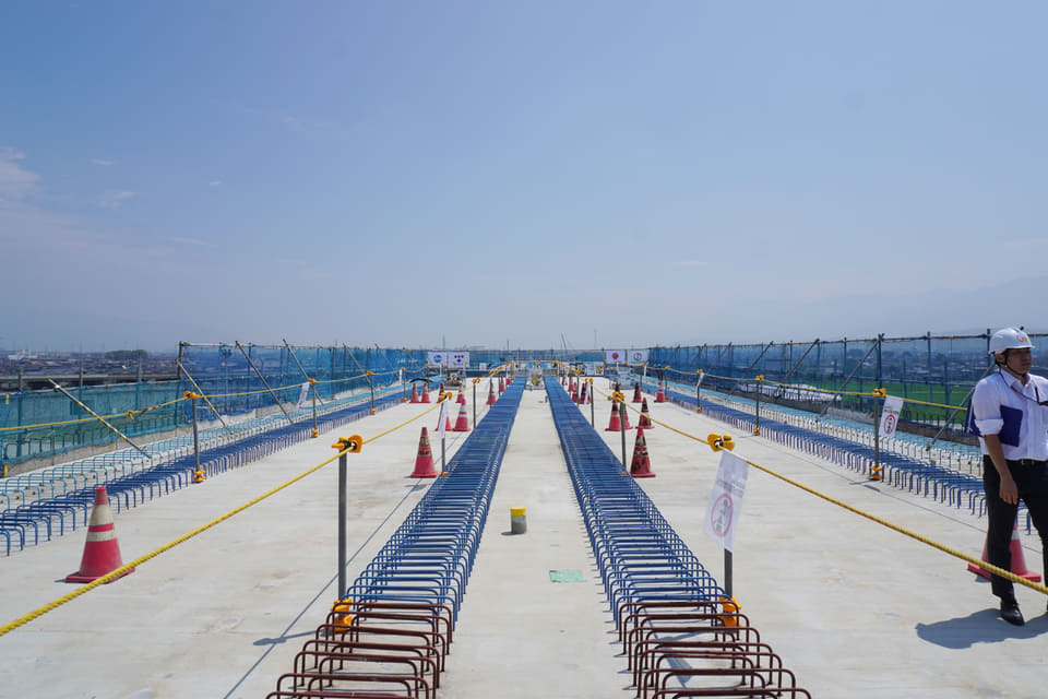 車輪とレールで走行する通常の鉄道とは異なり、リニアは車両を磁力で浮上・走行させるため、「ガイドウェイ」と呼ばれるコの字型の壁にコイルが埋め込まれた構造物がレールの役割を果たすが、最終的にはこの2つの橋りょう上にもガイドウェイが敷かれ、時速500kmを安全走行するため、そして防音・雪など環境対策のために、ガイドウェイをアーチ形に覆うフードや防音壁が設備される。