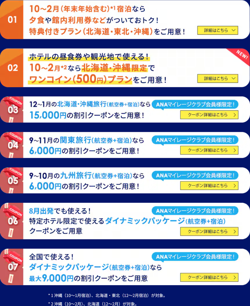 ほかにもANAマイレージクラブ会員限定で、12月~2026年1月出発分の北海道・沖縄旅行に利用できる1万5000円引きクーポンや、秋の関東・九州旅行に利用できる6000円引きクーポン、8月出発でも使えるホテル限定クーポンを配布する。
