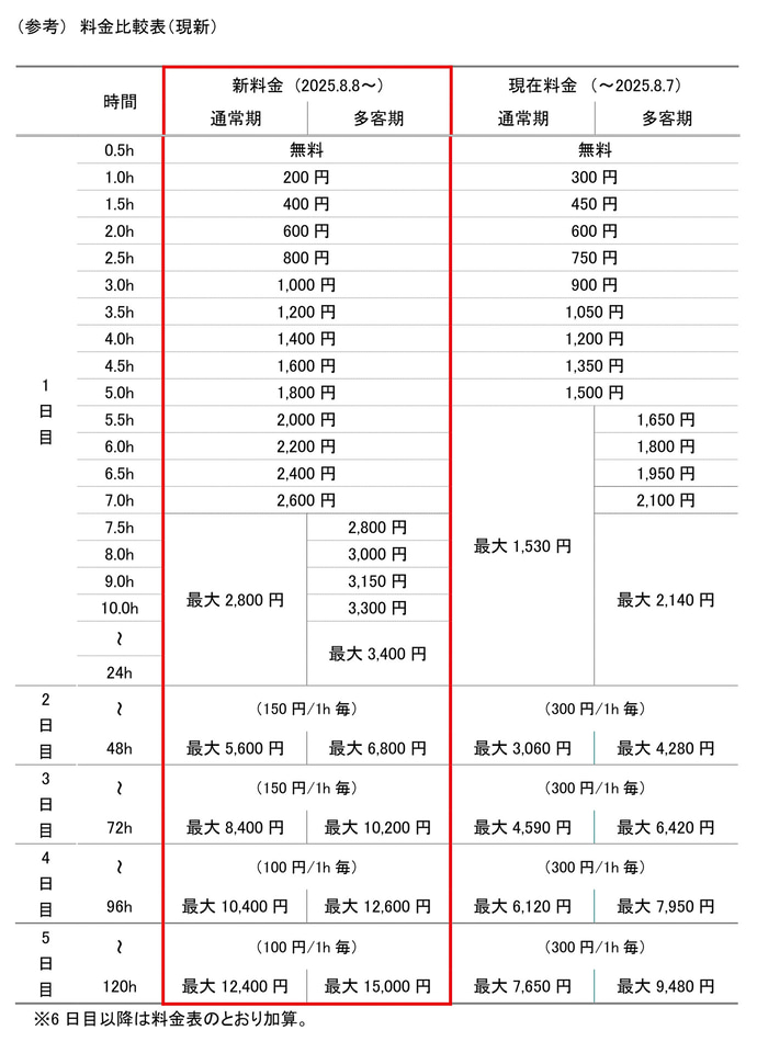 24時間ごとの最大料金は、通常期1530円を2800円に、多客期2140円を3400円にそれぞれ値上げするほか、入場後1時間以降の30分料金を150円から200円へ引き上げる(1時間~8時間)。