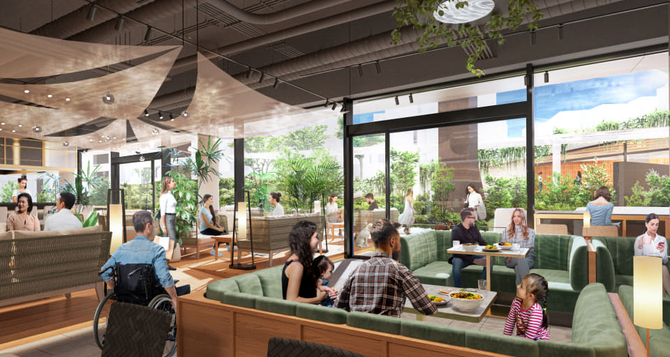 商業エリアは1~3階で、2つのダイニングホール、レストラン街、そのほかカフェ&ショップなどの専門店で構成。水辺や緑とのつながりを体感できる約1000席(店舗内客席約230席、テラス席約230席含む共用席約770席)の開放的な空間で、ジャンル多彩な食事が楽しめるという。
