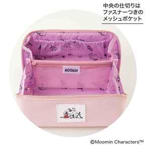 内側には3か所のポケットが備わるほか、中央の仕切り部分がファスナー付きメッシュポケットになっているのもポイント。デザインは外側にワンポイントタグ、内側にムーミンやリトルミイの総柄をあしらう。また、バッグのように持ち運びやすいハンドルも搭載している。