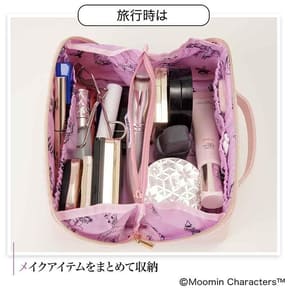 増刊号の特別付録には、旅行先でも自宅でも使える「ムーミン」ボックス型コスメ収納ケースが登場。必需メイク道具やスキンケア用品をしまえる約20×9×10cm(幅×奥行き×高さ)のサイズ感に加え、ファスナーでガバッと180度開いて自立する仕様なので、アイテムが出し入れしやすく、お目当てのモノも見つけやすい。