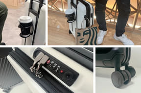 外装には軽くて丈夫なポリカーボネートとABS樹脂を採用し、斜めストライプが目立つデザインに。カラーはブラックとパールホワイトの2色をラインアップする。背面には立てた状態で開閉できるフロントオープン、ハンドル側にはカップホルダー、側面には荷物フックも備える。